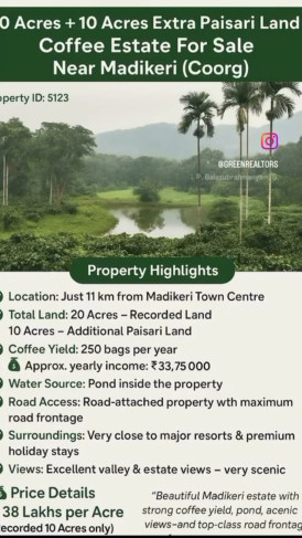 Whether you are looking to start your own agricultural venture, expand an existing farm, or simply enjoy the peaceful countryside, this property in Madikeri offers endless possibilities. Don't miss out on this rare opportunity to own a piece of paradise in the heart of Kodagu.