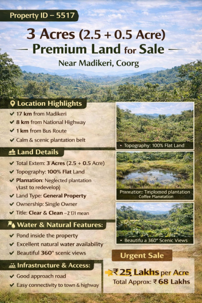 Located in the picturesque town of Madikeri in Kodagu, this expansive 3.5-acre agricultural/farm land offers a unique opportunity for those seeking a piece of land to cultivate and farm in the serene surroundings of this beautiful region.