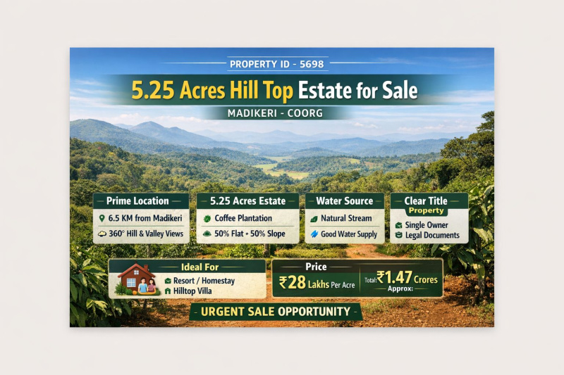 This 5.25 acre agricultural/farm land is located in the serene and picturesque town of Madikeri in Kodagu, also known as Coorg. The land is ideal for those looking to start a farming venture or invest in agricultural activities in one of the most beautiful regions of Karnataka.